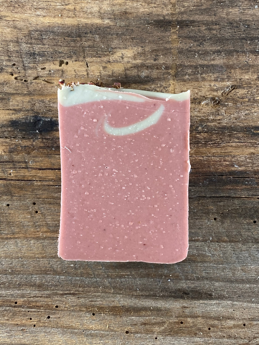 Ingredients: Lard, Olive Oil, Mango Seed Butter, Water, Sodium Hydroxide, Castor Oil, Raw Goats Milk, Water, Rice Bran Oil, Coconut Oil, Essential Oils (Frankincense, Geranium, Lemon), French Green Clay, Bentonite Clay, Australian Pastel Pink Clay, Rose Petals -